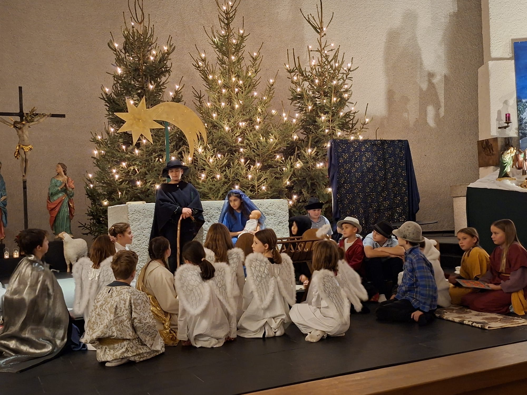Viele Familien besuchten mit ihren Kindern die Familienweihnachtsfeier. Es wurde die biblische Geschichte von der Geburt Jesu erzählt und gespielt, aber auch die Geschichte vom Glocken-Engelchen, das nicht am Himmelskonzert teilnehmen durfte, weil es mit seinen Glocken nur fröhliche Lieder spielen konnte. Der Engel Gabriel sah, wie das Engelchen übte und übte und hatte Mitleid. Per Telefon stoppte er die Gruppe der Engel, Hirten und Leute aus Bethlehem, damit das Glocken-Engelchen vorne mitlaufen und dem Jesuskind das Lied «Kling Glöcklein» vorspielen konnte. Beim gemeinsamen Singen vom Lied ertönten alle Glöckli, die die Kinder als kleines Bhaltis erhielten.